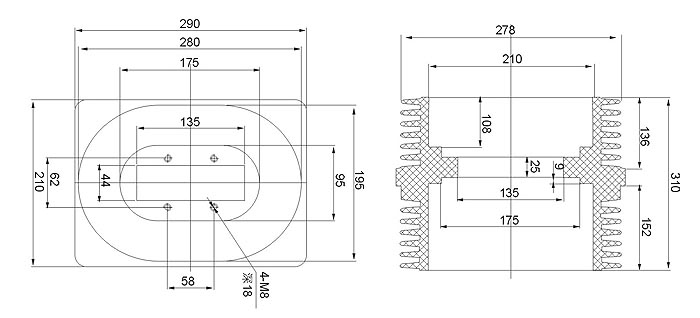 24KV屏蔽套管為環(huán)氧樹脂APG工藝壓力凝膠成型結(jié)構(gòu),外形結(jié)構(gòu)尺寸大小為128(100×100)mm、高225mm。主要適用于額定電壓為10KV及以下的成套設(shè)備中,作絕緣隔離和聯(lián)接過度之用。套管耐污及潮濕,無需特別維護,只需定期地清理表面污質(zhì)。安裝時母排從孔內(nèi)穿過。