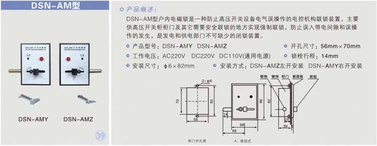 DSN型系列戶內(nèi)電磁鎖是一種防止高壓開關(guān)設(shè)備電器誤操作的電控機構(gòu)聯(lián)鎖裝置。主要適用于戶內(nèi)高壓開關(guān)設(shè)備的前后柜門、隔離開關(guān)、斷路器、接地線等需要閉鎖部位實現(xiàn)聯(lián)鎖,防止誤操作的發(fā)生,是發(fā)電和供電部門不可缺少的閉鎖裝置。另外,為適應(yīng)綜合自動化變電站的需要,該系列電磁鎖亦增加了鎖內(nèi)輔助接點。能在鎖具的合分位置給用戶提供一對相應(yīng)的開關(guān)接點,便于用戶鎖具相互聯(lián)鎖及綜合自動化采樣,避免了走空和,是現(xiàn)代化變電站設(shè)備理想的閉鎖裝置。專利產(chǎn)品“電控鎖”解決了綜合自動化變電站中機械程序鎖鑰匙無法進行控制管理的缺陷。