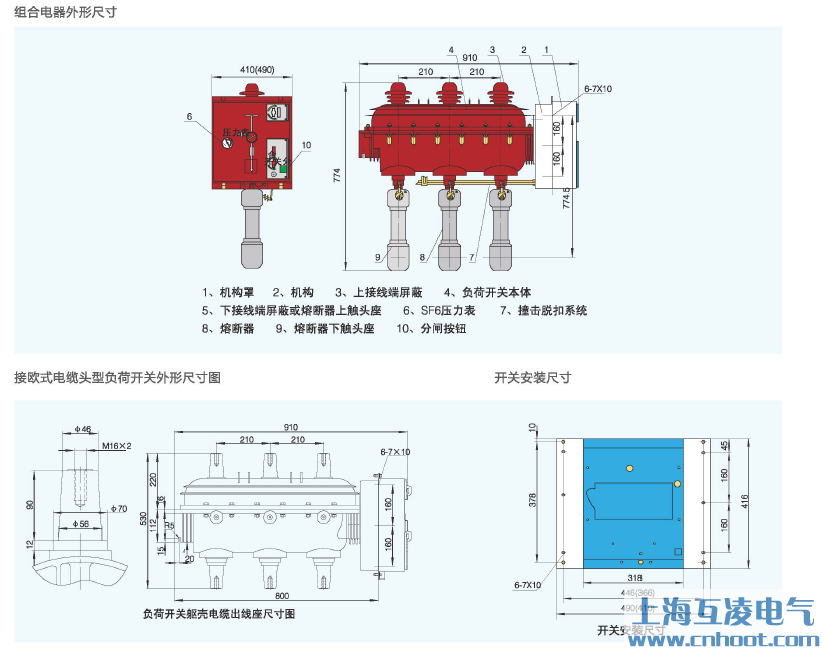 負(fù)荷開關(guān)和組合電器由相同的絕緣軀殼開關(guān)本體、相同的彈簧操動機構(gòu)、熔斷器觸頭座和熔斷器動作撞擊脫扣系統(tǒng)組成。裝可觸摸型電纜前接頭負(fù)荷開關(guān)由專用的絕緣軀殼開關(guān)本體、通用的彈簧操動機構(gòu)組成。