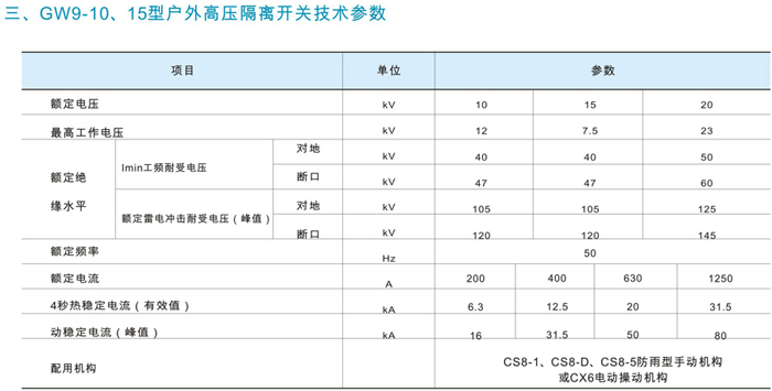 GW9-10/15型隔離開關(guān)按防污等級(jí)來(lái)分有2種:GW9-10和GW9-10W按電流分:有200A 400A 630A 800A 1000A 1250A、按電壓分:有10KV 15KV。