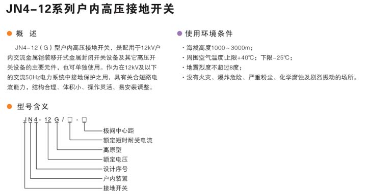 JN4-12(G)型戶內(nèi)高壓接地開關(guān),適用于12kV戶內(nèi)交流金屬鎧裝移開式金屬封閉開關(guān)設(shè)備及其它高壓開關(guān)設(shè)備的主要元件,也可單獨使用。作為在12中kV,及以下的交流50Hz電力系統(tǒng)中接地保護之用,具有關(guān)全短路電流能力,結(jié)構(gòu)合理、體積小、操作靈活、易安裝調(diào)整。