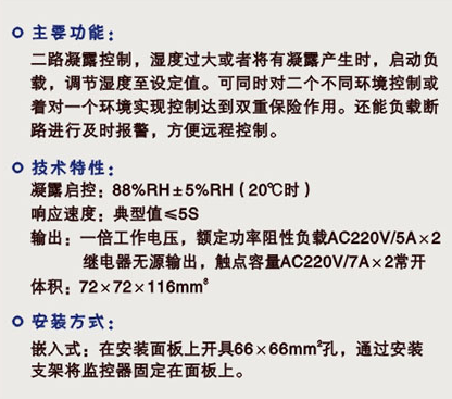 二路凝露控制,濕度過(guò)大或者將有凝露產(chǎn)生時(shí),啟動(dòng)負(fù)載,調(diào)節(jié)濕度至設(shè)定值??赏瑫r(shí)對(duì)二個(gè)不同環(huán)境控制或者對(duì)一個(gè)環(huán)境實(shí)現(xiàn)控制達(dá)到雙重保險(xiǎn)作用。還能負(fù)載斷路進(jìn)行及時(shí)報(bào)警,方便遠(yuǎn)程控制。