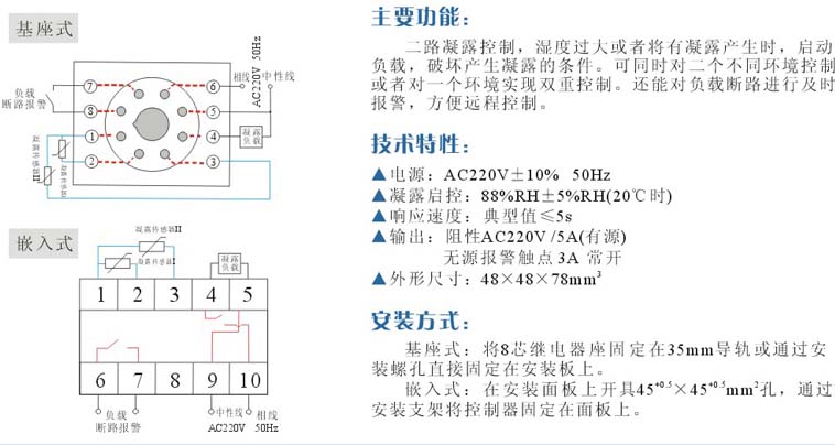 二路凝露控制,濕度過大或者將有凝露產生時,啟動負載,破壞產生凝露的條件。可同時對二個不同環(huán)境控制或者對同一個環(huán)境實現(xiàn)雙重控制