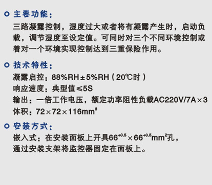 三路凝露控制,濕度過大或者將有凝露產(chǎn)生時(shí),啟動負(fù)載,調(diào)節(jié)濕度至設(shè)定值??赏瑫r(shí)對三個不同環(huán)境控制或者會一個環(huán)境實(shí)現(xiàn)控制達(dá)到三重保險(xiǎn)作用。