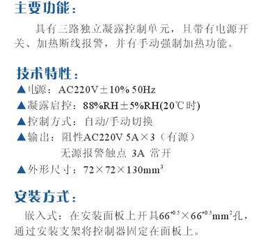 具有三路獨(dú)立凝露控制單元,且?guī)в须娫撮_關(guān),及加熱斷線報(bào)警,并有手動(dòng)強(qiáng)制加熱功能。