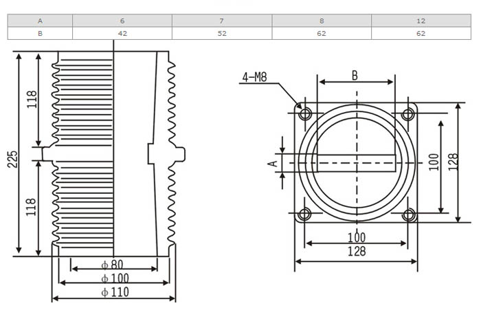 TG4-10Q套管為環(huán)氧樹脂APG工藝壓力凝膠成型結(jié)構(gòu),外形結(jié)構(gòu)尺寸大小為128(100×100)mm、高225mm。主要適用于額定電壓為10KV及以下的成套設(shè)備中,作絕緣隔離和聯(lián)接過度之用。套管耐污及潮濕,無需特別維護,只需定期地清理表面污質(zhì)。安裝時母排從孔內(nèi)穿過。